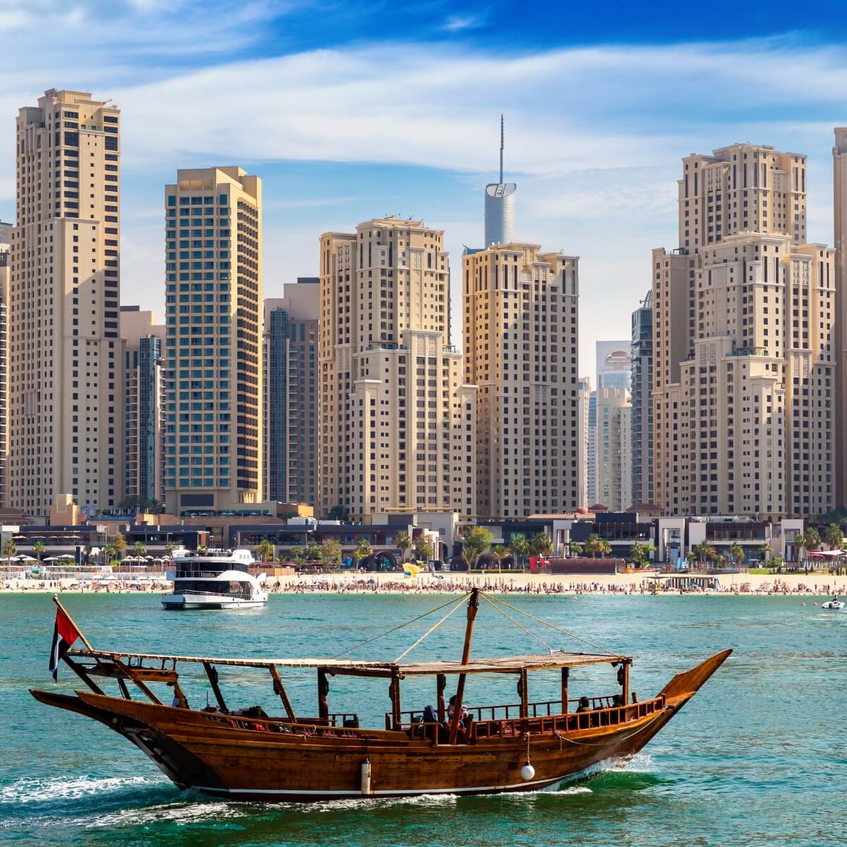 In the evening, indulge in a truly enchanting experience aboard a traditional dhow, a historical ship that has sailed the UAE’s waters for centuries.