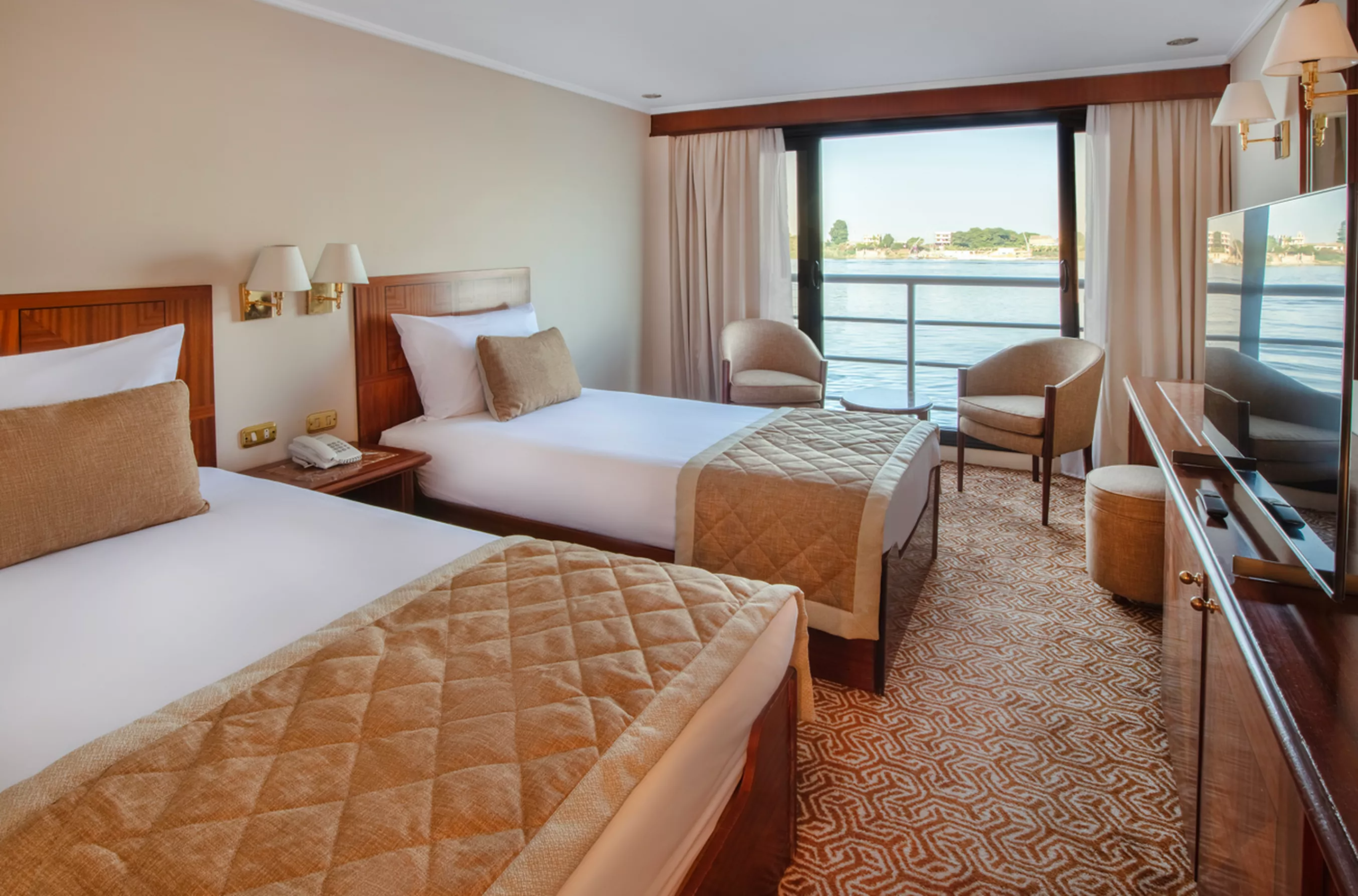 Designed across five elegant decks, the MS Jaz Celebrity offers an intimate boutique cruising experience with 66 stylish double cabins, 2 single cabins, and 2 spacious suites. Each cabin features large panoramic sliding windows, allowing uninterrupted views of the Nile’s ever-changing scenery. Thoughtful in-room amenities include air conditioning, satellite TV, minibar, in-room safe, and a private bathroom with shower. The cruise is also designed with accessibility in mind, featuring an elevator and wheelchair-friendly areas to ensure comfort for all travelers.
